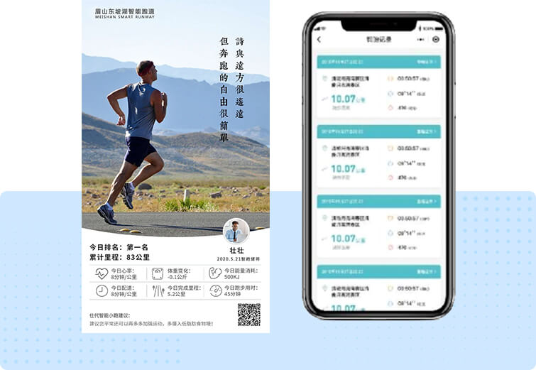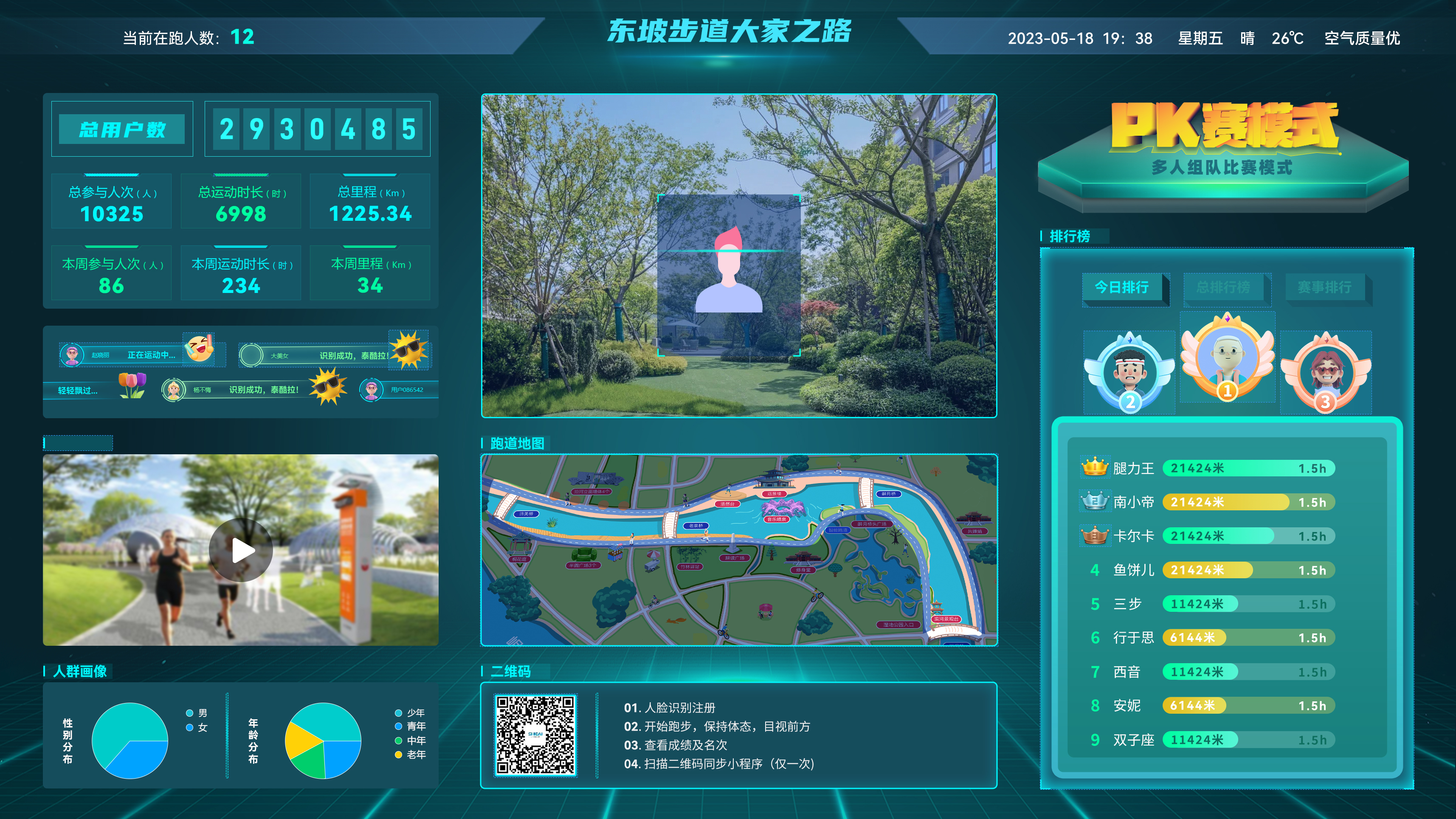 由智跑软件系统、运动监控设备、智慧大屏终端和移动端运动小程序组成,跑步者无需穿戴任何设备,在智慧大屏终端人脸识别注册后获取个人身份ID,通过部署在跑道沿线的运动监控设备实时监测跑步者状态并上传到云端进行算法分析,从而记录跑步者的跑步次数、时间、里程以及速度参数,运动结束后获取运动数据及排名。