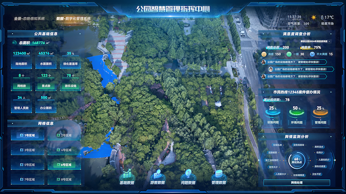 基于AR、VR、Iot、大数据等技术,将公园绿化、保洁、安保、设施设备等等诸要素叠加在公园全景地图上进行统一布局、统一管理,使公园管理实现从传统到数字化、智慧化的跃升;