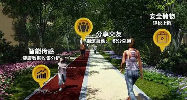 √ 在智慧社区,漫长的跑道被分割成几段,每抵达一小段目标,地面就会亮起提示并记录,配套app则会全程监测和分析你的健康数据。
